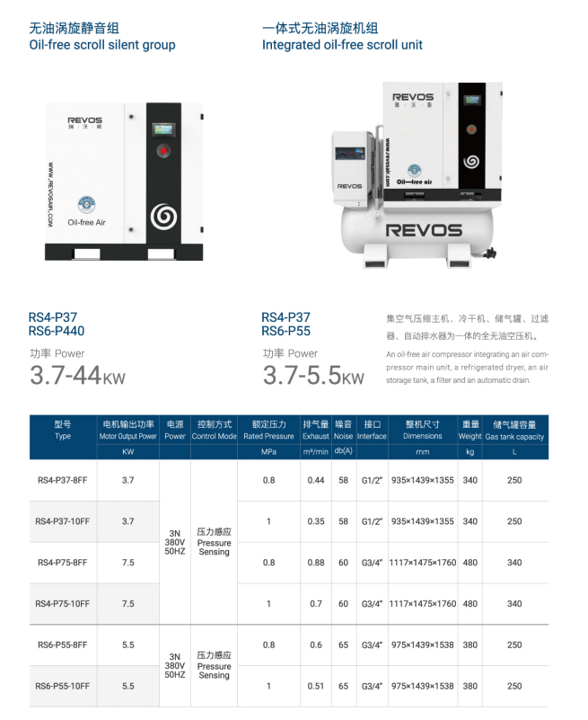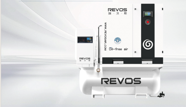 An oil-free scroll air compressor integrating an aircompressor main unit, a refrigerated dryer, a precisionfilter, an automatic drain and an air storage tank.